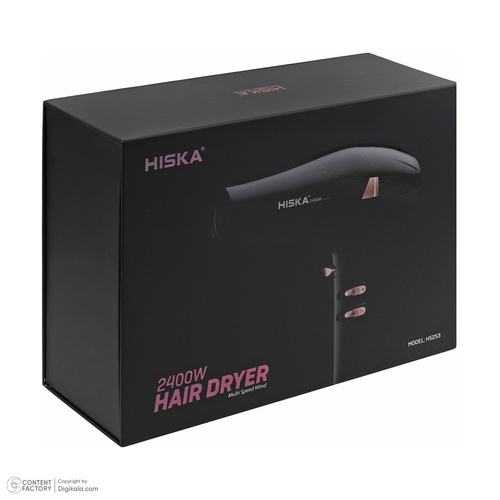 سشوار هیسکا مدل H5253 سشواری حرفه‌ای و مناسب کار در آرایشگاه است که دارای موتور 2400 وات AC، با فناوری تولید یون و دو متمرکز کننده‌ی هوا است. این مدل سشوار، از قوی ترین سشوارهای موجود در بازار محسوب می شود و حرارت بالای آن به همراه قدرت پرتاب بالای آن میتواند این محصول را به یکی از ایده آل ترین سشوارهای مخصوص براشینگ تبدیل کند. فناوری تولید یون در این سشوار به صورت خودکار است و با روشن شدن دستگاه شروع به کار می کند. این یون‌ها با باد سشوار خارج می‌شود و پس از برخورد به موها الکتریسیته ساکن روی آن‌ها را از بین می‌برند. به‌این‌ترتیب وز شدن مو کمتر اتفاق می‌افتد و حالت دادن به موها هم راحت‌تر می‌شود. این سشوار حرفه‌ای دارای دو متمرکز کننده‌ی هوا با اندازه‌های مختلف است که با توجه به نیاز می‌توان از یکی از آن‌ها استفاده کرد. فیلتر ورودی هوا را می‌توان به شکل چرخشی جدا کرده و آن را شست. به‌این‌ترتیب علاوه بر اینکه قدرت باد سشوار حفظ می‌شود، عمر آن هم افزایش می‌یابد. برای حالت دادن و خشک‌کردن موها می‌توان سرعت و حرارت باد را روی مقدار دلخواه تنظیم کرد. برای این کار باید از دکمه‌های روی دسته استفاده کرد که دو حالت سرعت متوسط و زیاد و سه حالت حرارت سرد و گرم و داغ را فراهم می‌کنند. از دیگر ویژگی‌های سشوار هیسکا مدل H5253 می‌توان به سیم 3 متری و حلقه‌ی آویزان کردن آن اشاره کرد که برای استفاده‌ی در مکان‌هایی مانند سالن‌های آرایشی ضروری هستند.