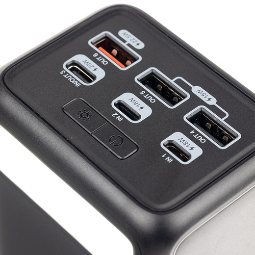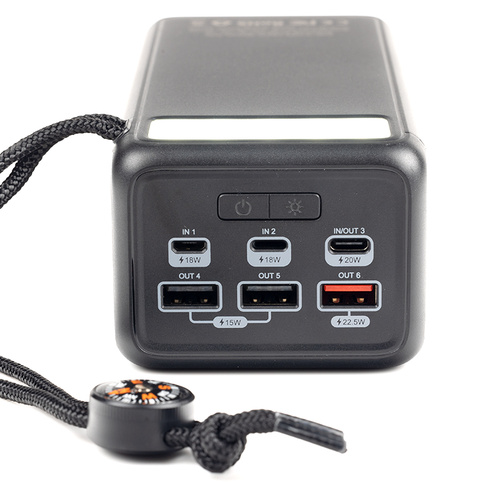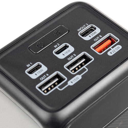 مشخصات فنیIN1 (Micro) lnput: 5V-2.0A/9V-2.0A IN2(Lightning) Input: 5V-2.0A/9V-2.0A IN/OUT3(TYPE-C) Input: 5V-3.0A/9V-2.0A IN/OUT3(TYPE-C)Output: 5V-3.0A/9V-2.2A/12V-1.5A OUT4(USB)Output: 5V-3.0A OUT5(USB) Output: 5V-3.0A OUT6(USB) Output: 4.5V-5A/5V-4.5A/9V-2.0A/12V-1.5A IN/OUT3/USB4/ USB5/USB6 Output intotal:5V-3.0A Flashlight:2W Output Max ; 22.5W