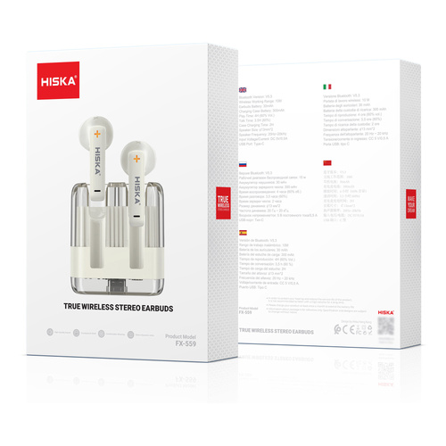 طراحی و تولید هندزفری بلوتوثی به دلیل حذف برخی از محدودیت‌های گوشی موبایل مانند امکان مکالمه امن حین رانندگی، گوش دادن به موسیقی در حال ورزش و رفع مشکل پیچ خوردن و پارگی سیم هندزفری ها مورد استقبال بی‌نظیر افراد قرار گرفت. هندزفری بلوتوثی هیسکا مدل FX-559 نمونه‌ای باکیفیت از هدفون‌های بلوتوثی است که سبک بوده و استفاده طولانی مدت از آن شما را آزار نمی‌دهد و می‌توانید در هر موقعیتی به راحتی موسیقی مورد علاقه خود را گوش بدهید. بدنه هندزفری بی سیم هیسکا FX-559 از پلی کربنات نسوز و پلاستیک ABS ساخته شده که مقاومتی بسیار بالا را به بدنه‌ی هندزفری داده؛ طراحی شفاف کیس آن، این محصول را از دیگر محصولات از نظر ساختاری متمایز کرده و فوق‌العاده جذاب است. ابعادی برابر با 19*42*46 میلی‌متر دارد. جمع‌وجور است و به آسانی درون جیب جا می‌گیرد. گوشی‌ها از نوع نیمه در گوش هستند؛ در ساختار آن‌ها خبری از کلاهک سیلیکونی نیست اما به خوبی در گوش قرار می‌گیرند و هنگام استفاده طولانی مدت هم احساس ناراحتی نخواهید کرد. هیسکا برای اتصال به هندزفری وایرلس FX-559، بلوتوث نسخه 5.3 را در نظر گرفته تا تجربه اتصالی سریع را برایتان به ارمغان بیاورد. برد مسافتی آن هم حدود 10 متر بدون مانع است. باتری لیتیوم پلیمری محفظه هدفون هیسکا ظرفیتی برابر با 300 میلی‌آمپر ساعت دارد و ظرفیت هدفون‌ها هم برابر با 30 میلی‌آمپر ساعت است که با شارژ کامل می‌تواند 4 ساعت پخش موسیقی، در حالت مکالمه 3.5 ساعت مورد استفاده قرار گیرد. شارژ محصول توسط درگاه تایپ سی موجود در کیس به مدت حدود 2 ساعت انجام پذیر است. پنل‌های لمسی که روی هندزفری وایرلس هیسکا طراحی شده، استفاده آسان‌تر را برای کاربر به همراه دارد. می‌توانید از آن برای کم و زیاد کردن صدا، تغییر آهنگ، قطع یا وصل تماس تلفنی، پلی و پاز کردن موسیقی استفاده نمایید.