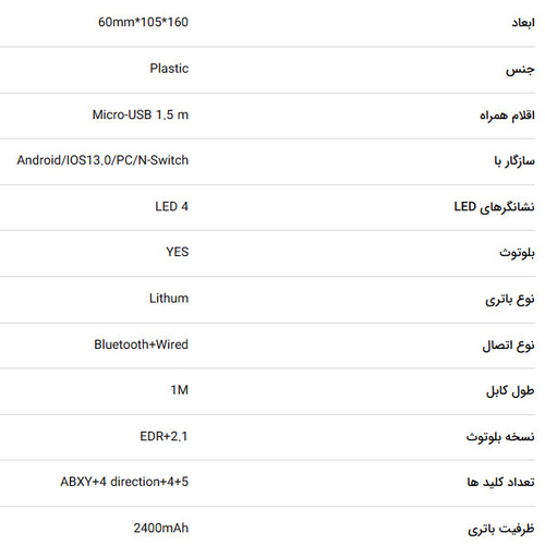 مشخصاتنسخه بلوتوث : 2.1 EDR xxx باتری : لیتیومی xxx ظرفیت باتری : 400 میلی آمپر xxx درگاه ارتباطی : بلوتوث + با سیم xxx تعداد کلید : 20 xxx سازگار :
