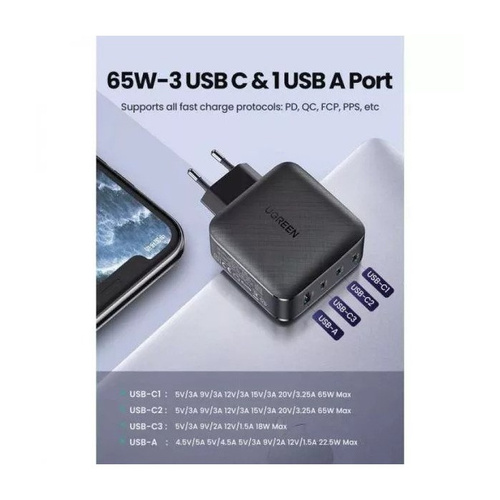 شارژر دیواری یوگرین مدل CD224-70774 در اندازه، عملکرد، ایمنی و طراحی منحصر به فرد است. این شارژر 65 وات GAN PD دارای طراحی ارگونومیک بوده و با وزن 165 گرمی و طراحی سبک و کوچک فضای بسیار کمی اشغال میکند. این شارژر با بهره گیری از فناوری نیترید گالیم (GaN) تولید شده است. GaN یک ماده نیمه هادی جدید است که هنگام انتقال میدان های الکتریکی بالاتر، عملکرد بهتری نسبت به سیلیکون دارد. نیترید گالیم نسبت به تراشه های سلیکونی سرعت بالاتر و صرفه جویی انرژی بیشتری دارد و نسبت به شارژرهای متداول در بازار عملکرد بهتری دارد. امروزه که کمپانی اپل تلفن های هوشمند را بدون شارژر عرضه میکند، خرید شارژر دیواری UGREEN GAN 65 W یک انتخاب منطقی برای طرفداران اپل به شمار می آید. شارژر GaN یوگرین، دارای 3 پورت USB-C و یک پورت USB-A است، پورت های USB-A در شارژرهای جدید کمتر بکار میرود زیرا پورت های USB-C سرعت بالاتری در مقایسه با پورت های USB-A تامین میکنند که شارژر های جدید مانند GaN 65W از آن پشتیبانی میکنند. این شارژر خروجی معادل با 65 وات دارد، به این معنی که حداکثر توان الکتریکی 65 وات را ارائه میدهد. اگر یک دستگاه به شارژر متصل کنید 65 وات دریافت میکند و اگر دستگاه دوم را متصل کنید، دستگاه اول 65 وات را کامل دریافت نمیکند چرا که شارژر نیاز به انتقال مقداری جریان الکتریکی به دستگاه دوم دارد. نکته قابل توجه این است که این شارژر مطابق با نیاز دستگاه متصل، انرژی ارسال میکند و بدین ترتیب باعث شارژ بیش از حد دستگاه شما نمیشود.