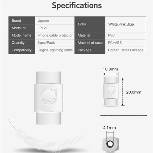 مشخصاتبرند: Ugreen تعداد: 6 عدد در بسته بندی جنس: پلی وینیل کلرید (PVC یا PVC) نازل در برابر کشش و خم شدن محافظت می کند و طول عمر کابل را افزایش می دهد سازگاری گسترده با تمام کابل های اصلی اپل