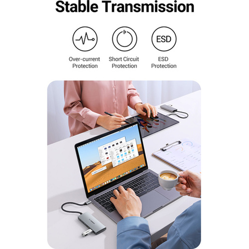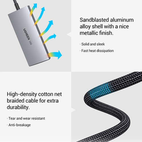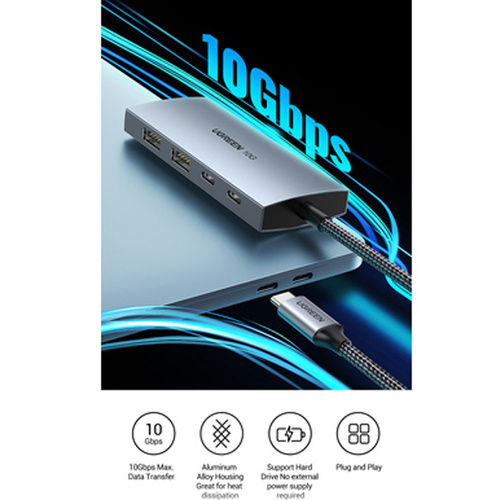 هاب چهار پورت یوگرین مدل CM480-30758 با دو پورت Type-C3.1 و دو پورت USB3.1 تجهیز شده است که می توان آنها را به دستگاه هایی مانند ماوس، صفحه کلید، هارد دیسک و غیره متصل کرد. این هاب از انتقال با سرعت 10 گیگابیت بر ثانیه پشتیبانی می کند.