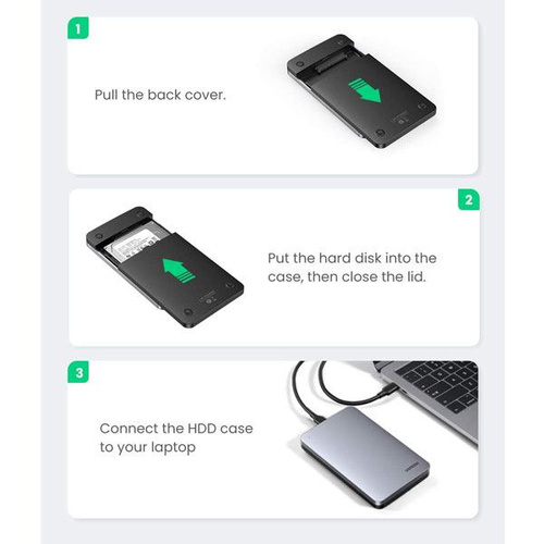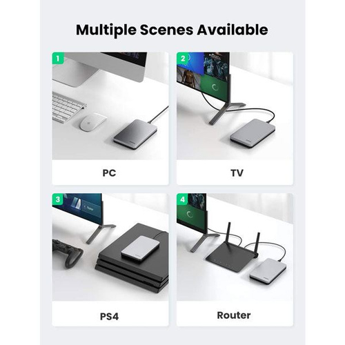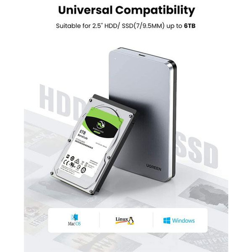 قاب هارد 2.5” SATA External یوگرین مدل CM300 کد 70498 به راحتی می‌تواند یک هارد SSD یا HDD 2.5 اینچی SATA را به کامپیوتر متصل کند تا فضای ذخیره سازی را افزایش دهد، سیستم را ارتقا دهد، از فایل ها نسخه پشتیبان تهیه کند، اطلاعات را بازیابی و بازیابی کند و اطلاعات را انتقال دهد. همچنین از هارد اکسترنال در برابر خط و خش های بیرونی محافظت کرده و هارد دیسک را برای ذخیره سازی اطلاعات قابل حمل می‌کند. پورت USB-C استاندارد USB 3.1 Gen 2 است که از سرعت 10 گیگابیت بر ثانیه و (7+15) پین SATA III حداکثر 6 گیگابیت بر ثانیه را پشتیبانی می‌کند. از ویژگی‌های مثبت این دستگاه می‌توان به نصب و راه اندازی آسان و بدون نیاز به هیچ درایوری اشاره کرد. سیستم عامل‌ها و دستگاه‌هایی که قاب هارد 2.5” SATA External یوگرین از آن‌ها پشتیبانی می‌کنند عبارتند از: سیستم‌ عامل‌های Windows/Mac OS/Linux کنسول‌های بازی مانند Sony PS4/PS3/Xbox One تلویزیون هوشمند روتر نقطه قوت قاب هارد 2.5” SATA External یوگرین مدل CM300 کد 70498 طراحی و ساخت آن است. این دستگاه از آلیاژ آلومینیوم ممتاز و بادوام ساخته شده است که در برابر حرارت مقاوم است. این ویژگی باعث می‎شود برای کار با سرعت بالا نیازی به فن خنک کننده نداشته باشد.