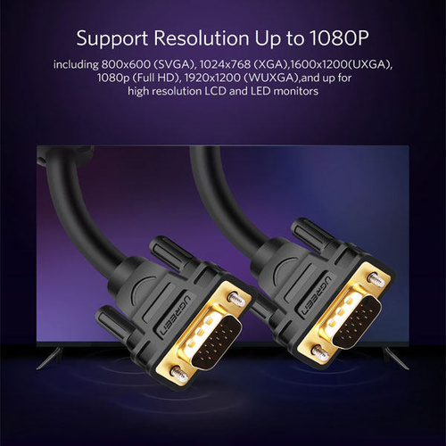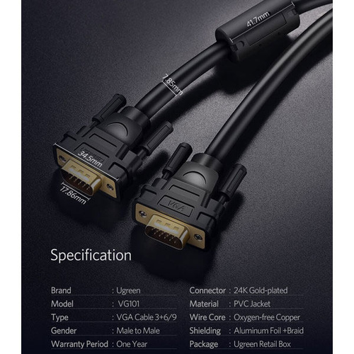 کابل VGA یوگرین مدل VG101-11631 یک درگاه استاندارد برای اتصال به دستگاههایی با قابلیت پخش فایلهای ویدئویی مانند مانیتور و پروژکتور است. برای اتصال این درگاه به مانیتور یا پروژکتور باید از کابلهایی با کانکتورهای VGA بهره گرفته شود. جنس بدنهی کابل از پلاستیک با کیفیت و سیمهای درون آن برای جلوگیری از نوسانات و ایجاد نویز ، از مس ساخته شده است. سرعت انتقال داده در این مدل قابل قبول است. در هر دو سمت این کابل کانکتور 15 پین VGA قرار گرفته و روی هریک از آنها با یک درپوش پلاستیکی پوشانده شده است. این درپوشها قابل جداشدن هستند و برای جلوگیری از ورود گردوغبار به داخل کانکتور در زمانهایی که از کابل استفاده نمیشود،بسیار مناسب هستند.