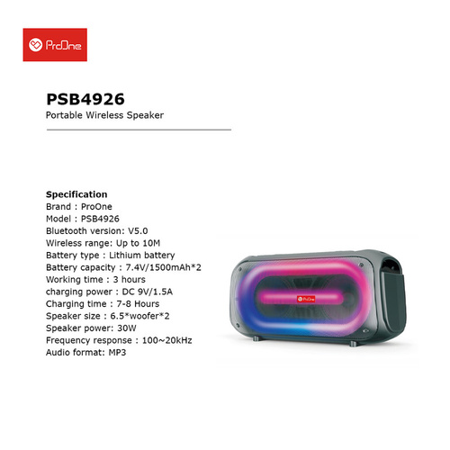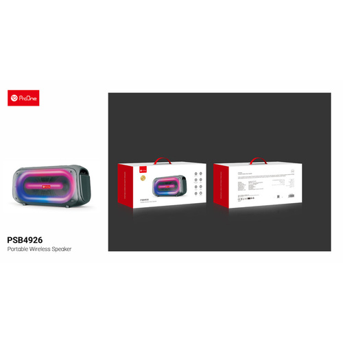 اسپیکر قابل حمل پرووان مدل PSB4926 از جمله اسپیکرهای قابل حملی است که می‌تواند به لحظه های شما رنگ و بوی ویژه‌ای ببخشد. توان این اسپیکر 30 وات بوده و دارای باتری 1500 میلی آمپری است. این اسپیکر بلوتوثی بوده و محدوده عملکردی آن تا 10 متر خواهد بود. این اسپیکر برای منازل، مهمانی، جلسات، مسافرت ، گردشگری و ... مناسب است.اسپیکر PSB4926 دارای دکمه‌های متفاوتی نظیر دکمه پاور، کم و زیاد کردن صدا، تنظیم نور و ... است. بدنه این اسپیکر از جنس پلاستیک سخت بوده و کیفیت مناسبی به شما ارائه می‌کند. این اسپیکر دارای رقص نور بوده و توانایی اتصال به دو دستگاه را بصورت همزمان داراست.اسپیکر قابل حمل پرووان مدل PSB4926 دارای چراغ LED و صفحه نمایش است. اطلاعات مورد نظر را می‌توان از طریق این صفحه نمایش مشاهده کنید. از ویژگی های دیگر این محصول میکرفون داخلی آن هست که درصورت نصب کارت حافظه صدای محیط را ظبط میکند.